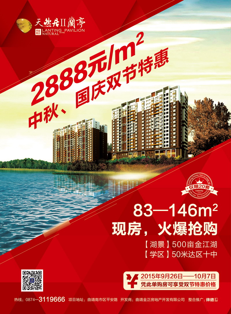 •     時(shí)至中秋、國(guó)慶雙節(jié)同慶,天然居Ⅱ蘭亭將于2015年9月26日至10月7日雙節(jié)期間傾情推出2888元/m²,不限戶(hù)型、樓層(僅限20套房源)的購(gòu)房?jī)?yōu)惠活動(dòng),房源有限,先到先得!